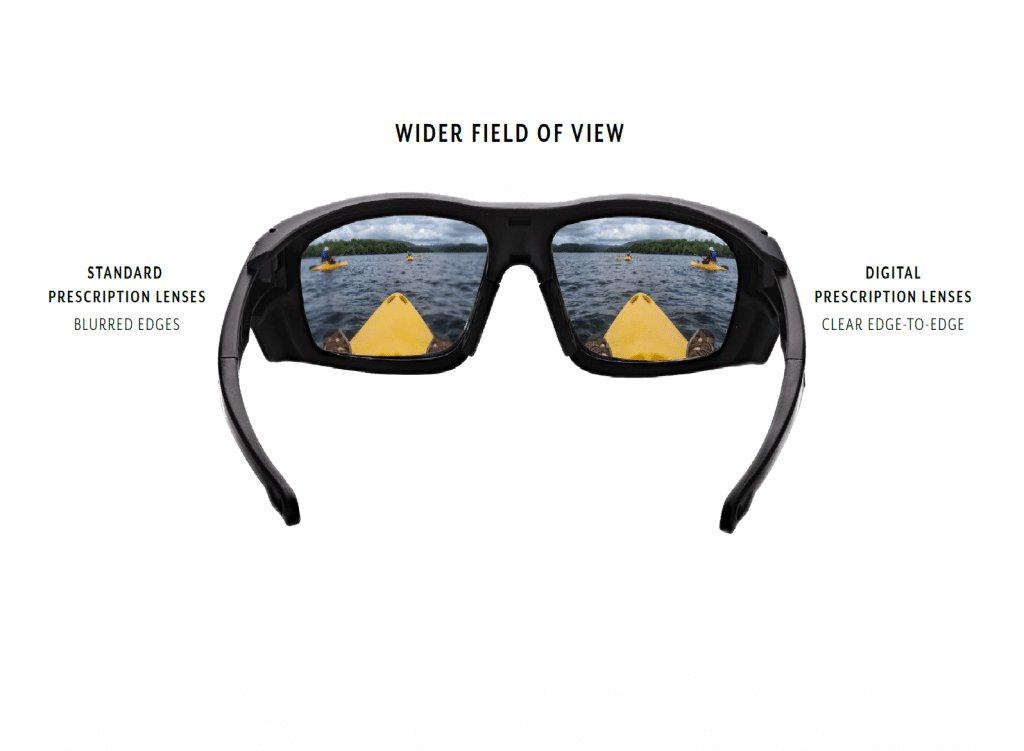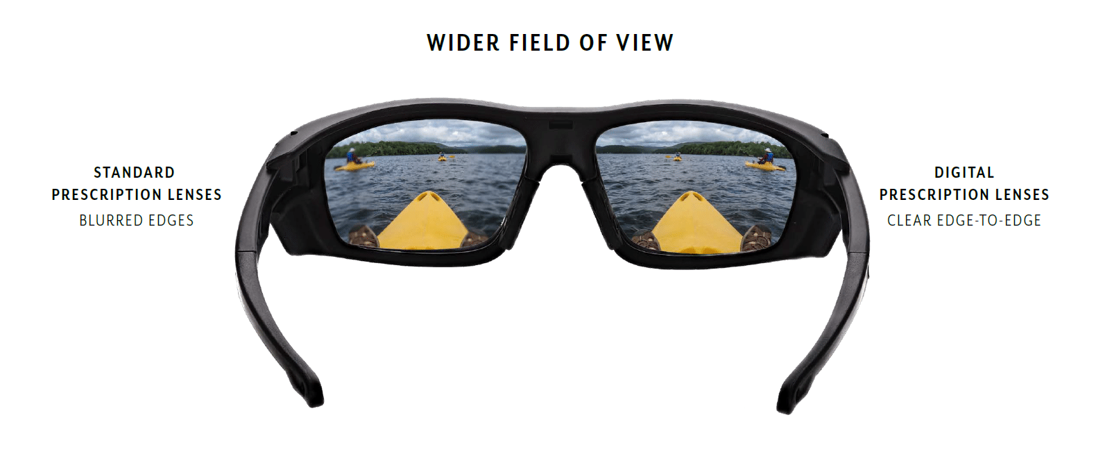 • Digital lenses are a newer technology that offer the best optics possible. Available in both eyeglasses and sunglasses, digital lenses provide better clarity and minimize edge-to-edge distortion to give you a wider field of view, as seen in the image below.