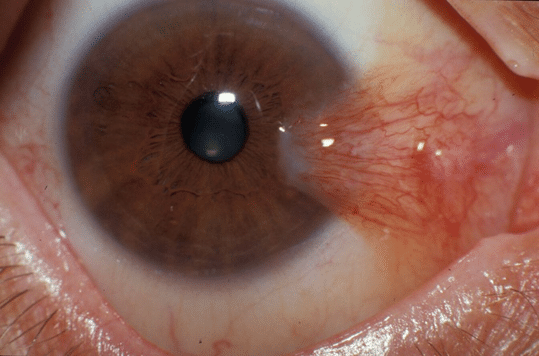 A white tissue growth that extends from white part of the eye onto the cornea and grows with sun repeated sun exposure. Typically starts on the cornea near the nose, it can be remove with surgery if it is affecting vision but reoccurs in about half of cases. Symptoms include persistent redness, inflammation, foreign body sensation, tearing, dry and itchy eyes and can cause problems for the sufferer.