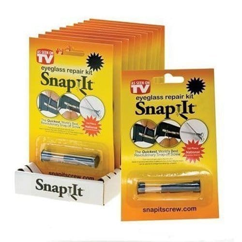 This pocket-size eyeglass repair kit allows you to repair your glasses at anytime-anywhere. These high-quality stainless steel screws have a unique, extra long feeder tab that makes handling screws a cinch and repairs a pleasure. Includes 5 different size Snapit screws and special screw driver. Insert screw into any hinge or eyewire, once tightened, the long feeder tab simply snaps off cleanly with just your fingers leaving a smooth finish. Drop it in, Screw it down, Snap it Off, and you’re done!