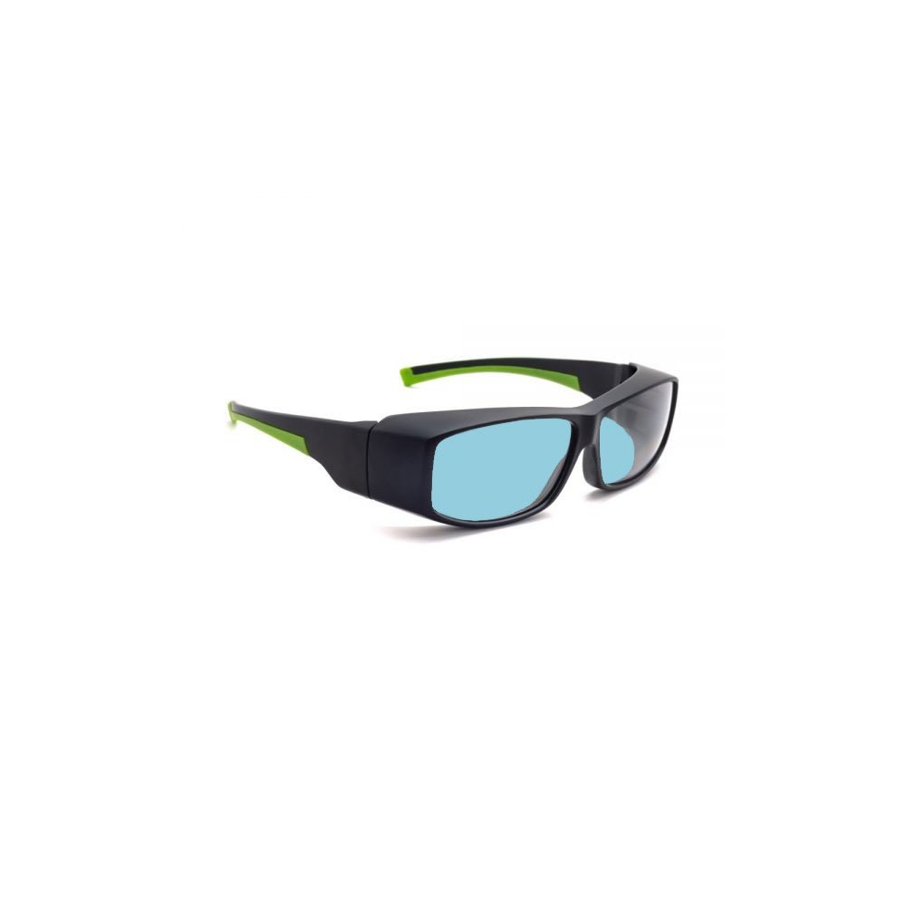 The BGKG lens filter is a light blue laser safety lens, cut and mounted into the 17001 model. A rectangular plastic frame that is very durable and provides a comfortable fit. This large fit frame provides a green accent secure grip rubber temples and integrated lateral protection. ANSI Z87+ Approved.