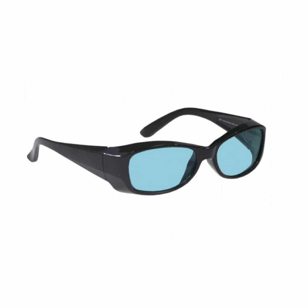 The BGKG lens filter is a light blue laser safety lens, cut and mounted into the 375 black frame. The frames head hugging temple design gives excellent splash and side protection. ANSI Z87-2003 Approved.