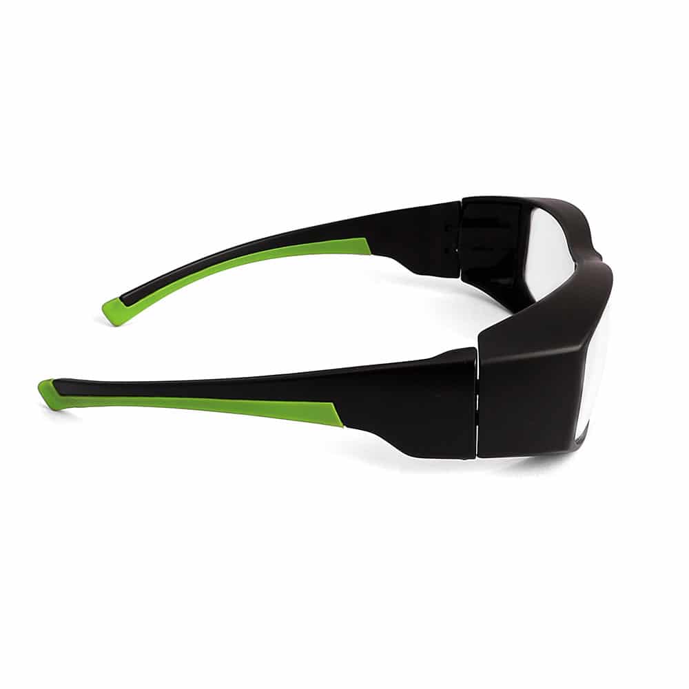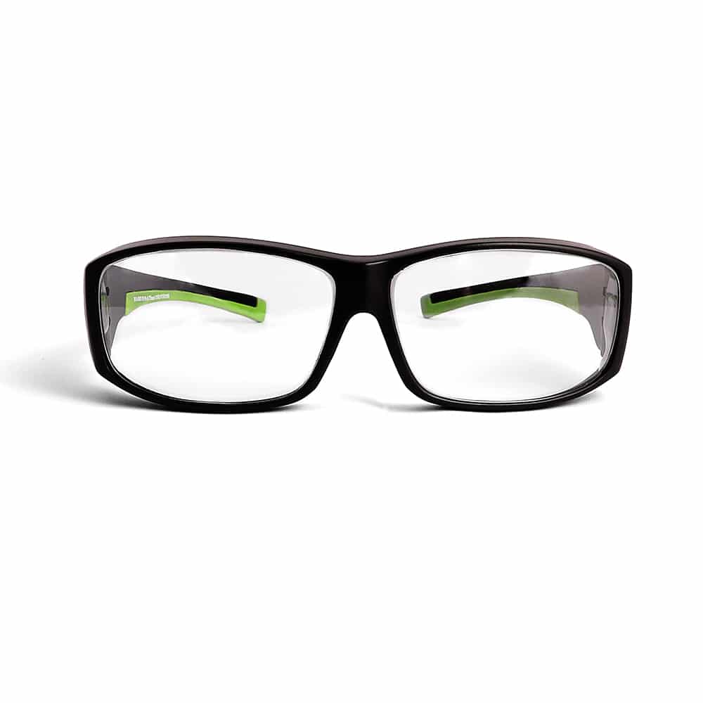 The RG-17001 is a rectangular plastic frame that is very durable and provides a comfortable fit. This large fit frame provides green accent secure grip rubber temples and integrated lateral protection. These can also be worn as a small fitover. This product comes with our standard high quality, distortion-free SF-6 Schott glass radiation-reducing lenses with .75mm lead equivalency